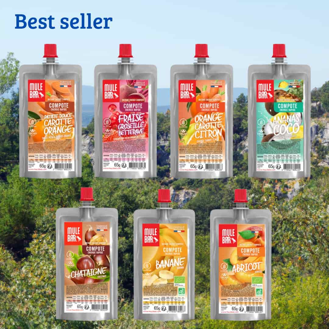 Tous nos produits (sauf le gel caramel salé) sont vegan, 6 barres et 2 compotes sont bio. Les gels (sauf café), les compotes et les boissons ne contiennent pas de gluten.